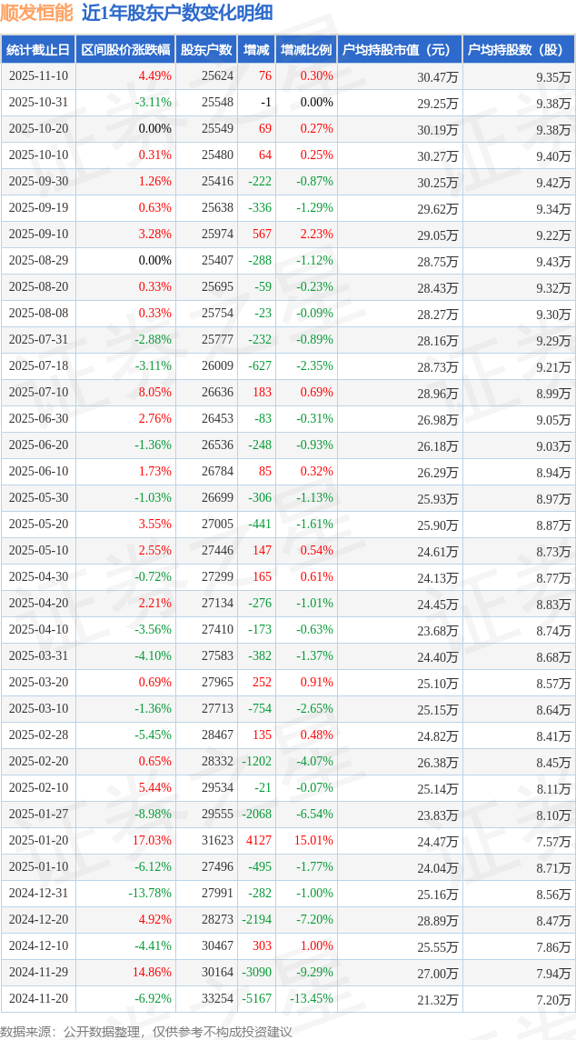 从股价来看,2025年10月31日至2025年11月10日,顺发恒能区间涨幅为4.49%,在此期间股东户数增加76.0户,增幅为0.3%。