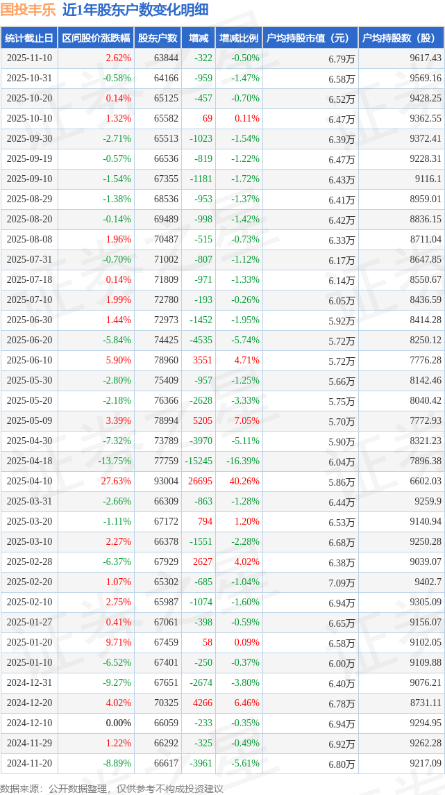从股价来看,2025年10月31日至2025年11月10日,国投丰乐区间涨幅为2.62%,在此期间股东户数减少322.0户,减幅为0.5%。