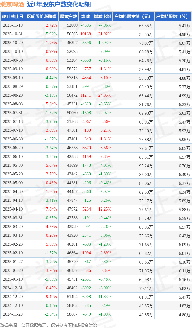 从股价来看,2025年10月31日至2025年11月10日,燕京啤酒区间涨幅为2.72%,在此期间股东户数减少4505.0户,减幅为7.96%。