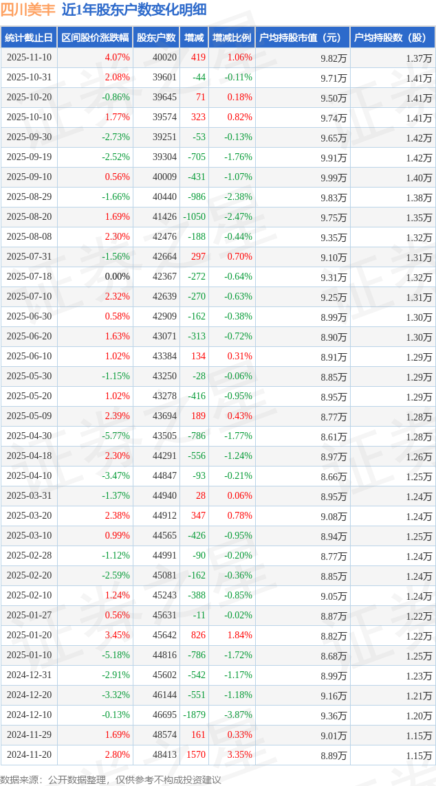 从股价来看,2025年10月31日至2025年11月10日,四川美丰区间涨幅为4.07%,在此期间股东户数增加419.0户,增幅为1.06%。