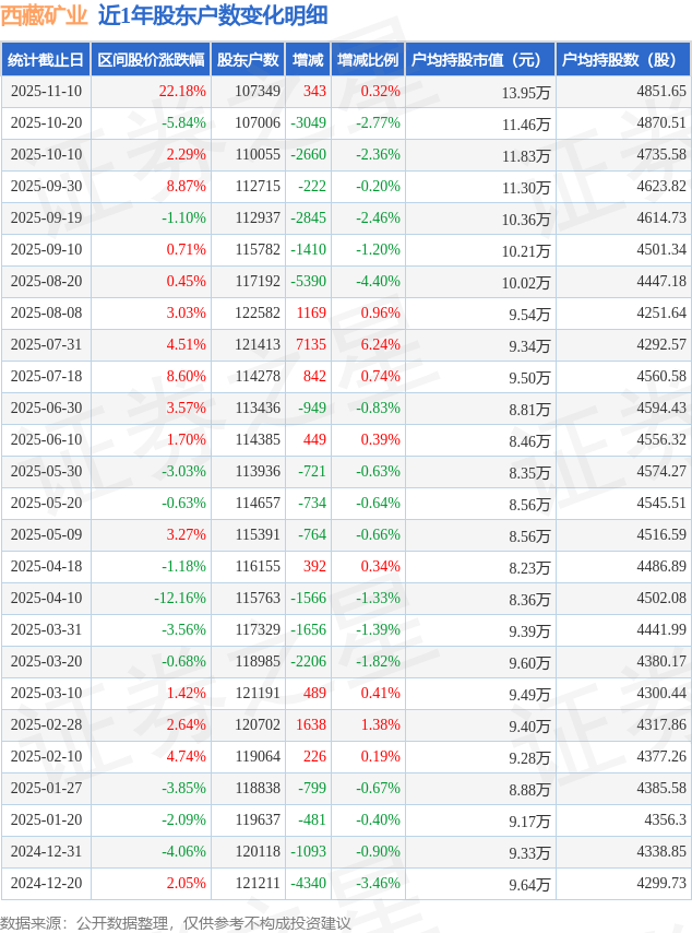 从股价来看,2025年10月20日至2025年11月10日,西藏矿业区间涨幅为22.18%,在此期间股东户数增加343.0户,增幅为0.32%。