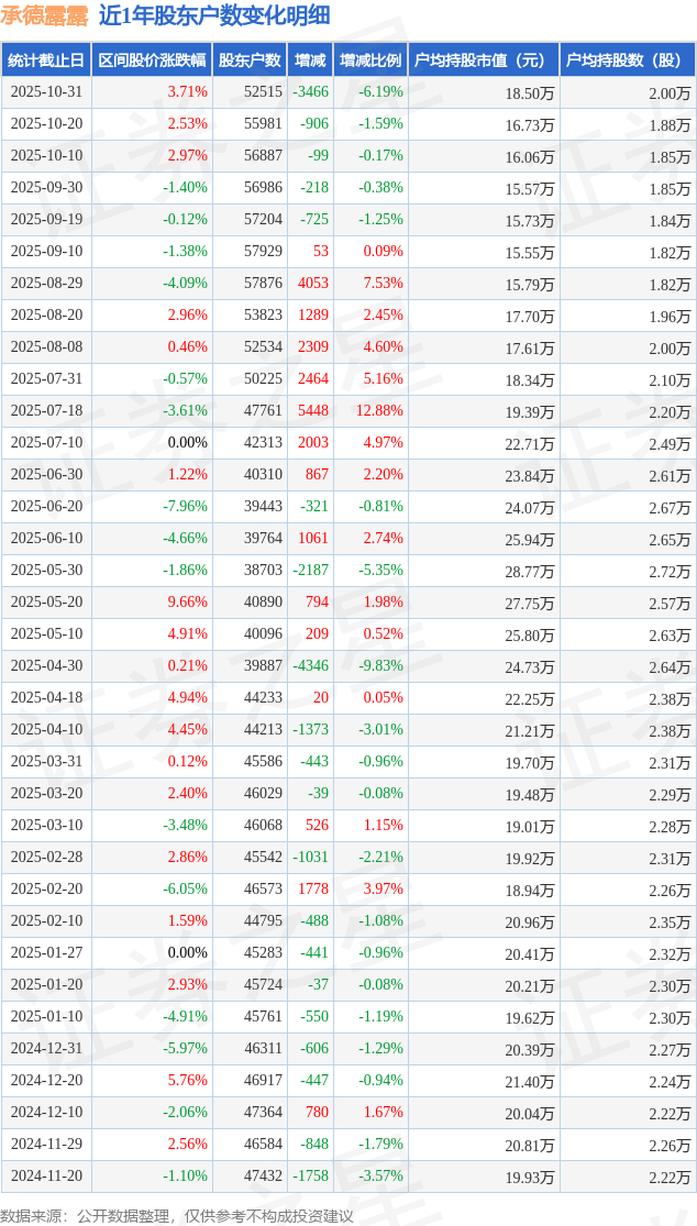 从股价来看,2025年10月20日至2025年10月31日,承德露露区间涨幅为3.71%,在此期间股东户数减少3466.0户,减幅为6.19%。