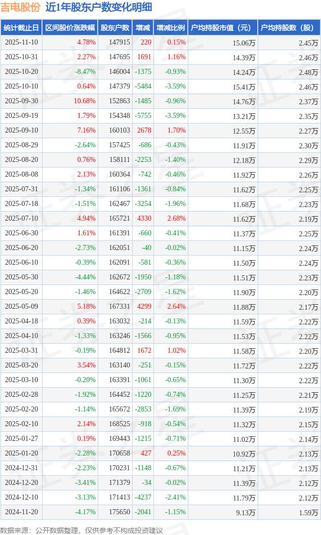 证券之星消息,近日吉电股份披露,截至2025年11月10日公司股东户数为14.79万户,较10月31日增加220.0户,增幅为0.15%。户均持股数量由上期的2.46万股减少至2.45万股,户均持股市值为15.06万元。