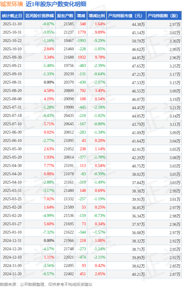 从股价来看,2025年10月31日至2025年11月10日,城发环境区间跌幅为0.07%,在此期间股东户数增加348.0户,增幅为1.64%。