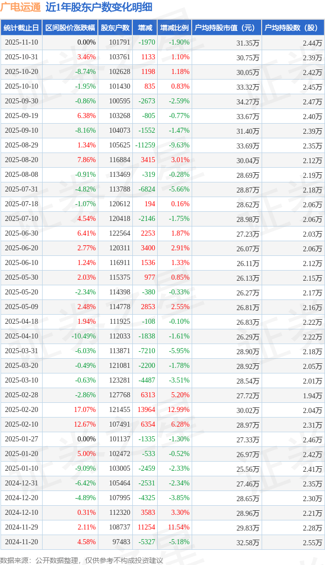 从股价来看,2025年10月31日至2025年11月10日,广电运通区间跌幅为0.0%,在此期间股东户数减少1970.0户,减幅为1.9%。