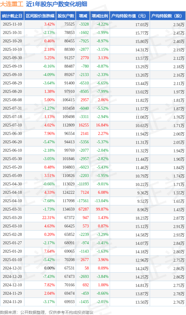 从股价来看,2025年10月31日至2025年11月10日,大连重工区间涨幅为3.42%,在此期间股东户数减少3328.0户,减幅为4.22%。