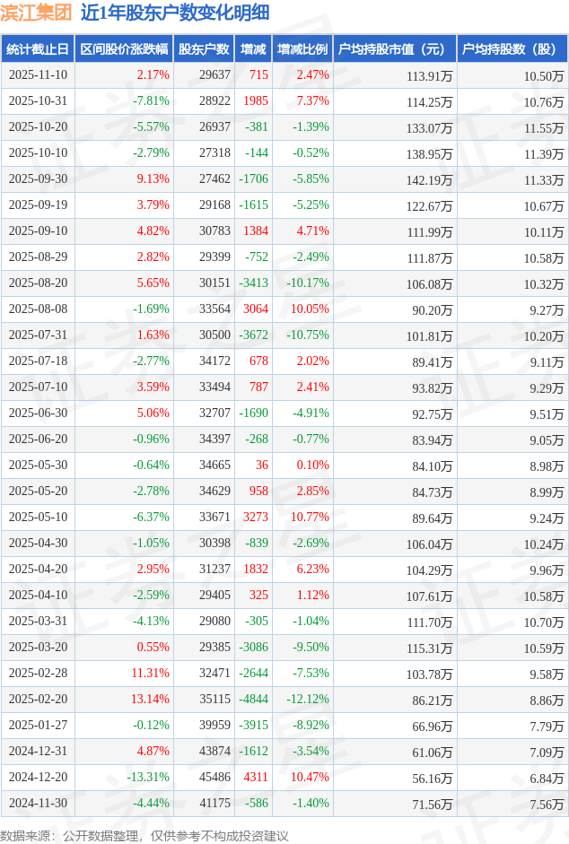 从股价来看,2025年10月31日至2025年11月10日,滨江集团区间涨幅为2.17%,在此期间股东户数增加715.0户,增幅为2.47%。