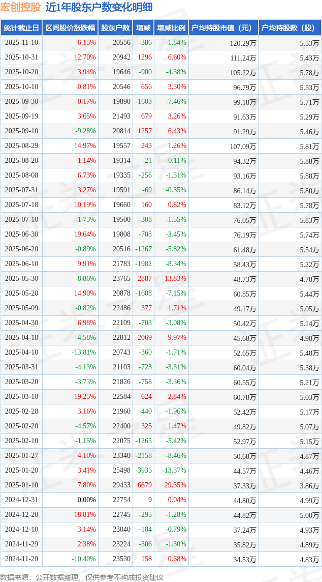 从股价来看,2025年10月31日至2025年11月10日,宏创控股区间涨幅为6.15%,在此期间股东户数减少386.0户,减幅为1.84%。