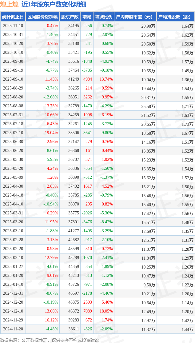 从股价来看,2025年10月31日至2025年11月10日,煌上煌区间涨幅为0.47%,在此期间股东户数减少256.0户,减幅为0.74%。