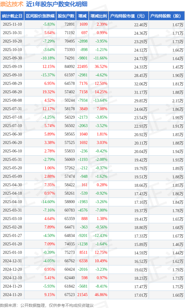 从股价来看,2025年10月31日至2025年11月10日,崇达技术区间跌幅为5.83%,在此期间股东户数增加1699.0户,增幅为2.39%。