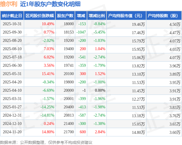 证券之星消息,近日维尔利披露,截至2025年10月31日公司股东户数为1.8万户,较9月30日减少153.0户,减幅为0.84%。户均持股数量由上期的4.47万股增加至4.5万股,户均持股市值为19.46万元。