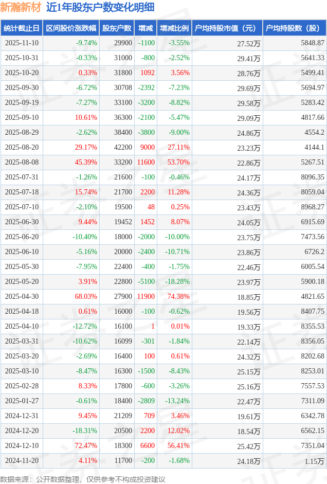 从股价来看,2025年10月31日至2025年11月10日,新瀚新材区间跌幅为9.74%,在此期间股东户数减少1100.0户,减幅为3.55%。