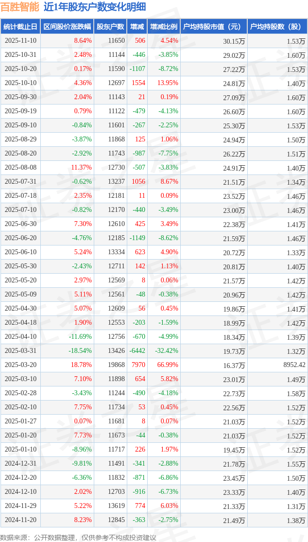 从股价来看,2025年10月31日至2025年11月10日,百胜智能区间涨幅为8.64%,在此期间股东户数增加506.0户,增幅为4.54%。