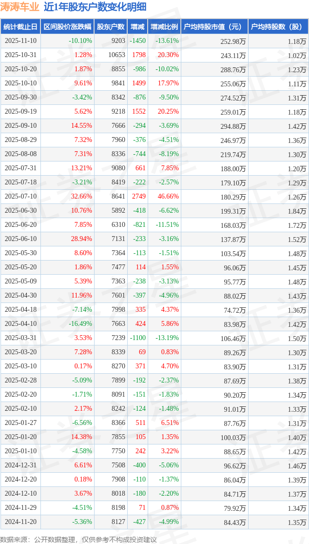 从股价来看,2025年10月31日至2025年11月10日,涛涛车业区间跌幅为10.1%,在此期间股东户数减少1450.0户,减幅为13.61%。