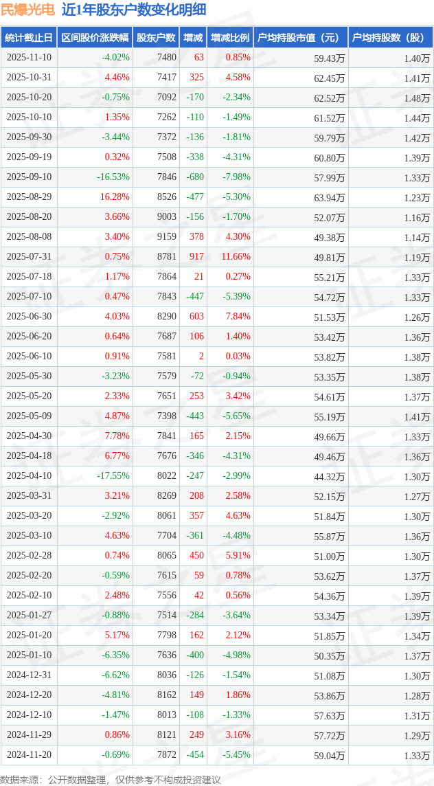 从股价来看,2025年10月31日至2025年11月10日,民爆光电区间跌幅为4.02%,在此期间股东户数增加63.0户,增幅为0.85%。