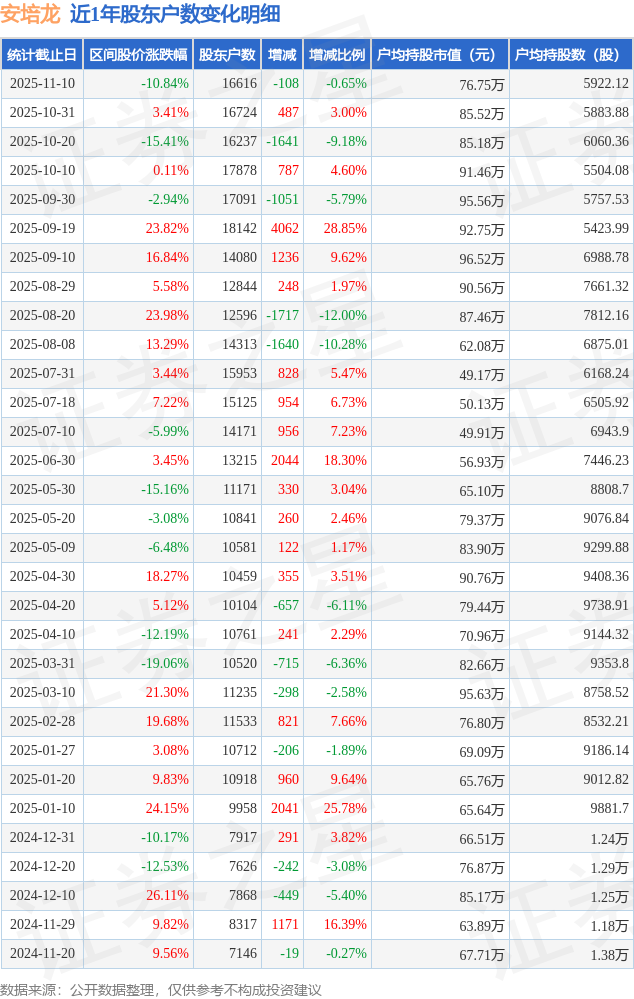 从股价来看,2025年10月31日至2025年11月10日,安培龙区间跌幅为10.84%,在此期间股东户数减少108.0户,减幅为0.65%。
