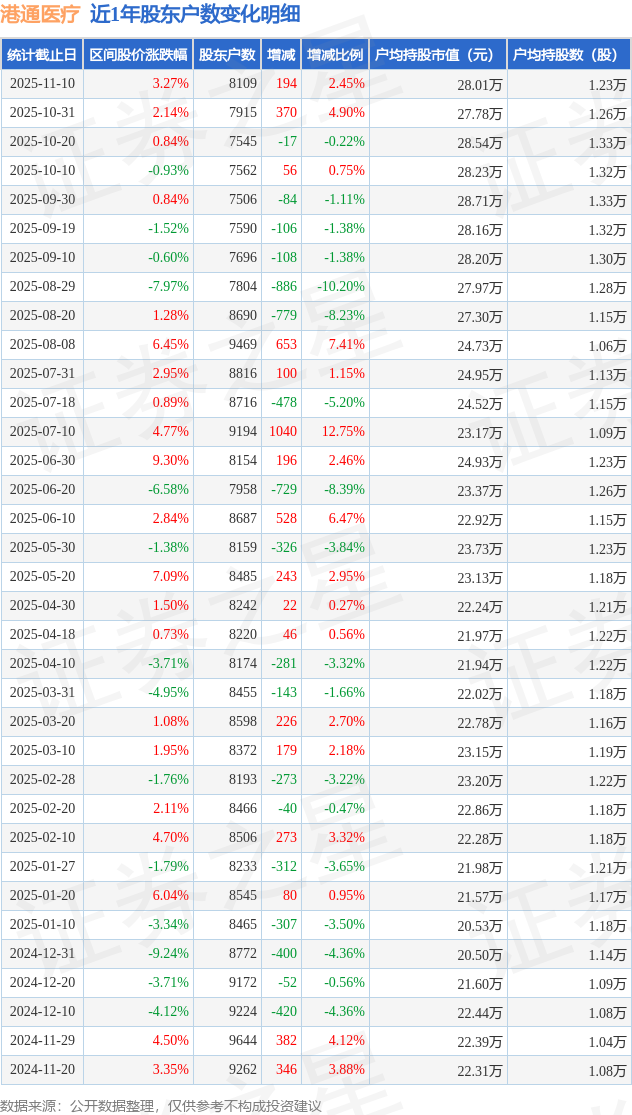 从股价来看,2025年10月31日至2025年11月10日,港通医疗区间涨幅为3.27%,在此期间股东户数增加194.0户,增幅为2.45%。