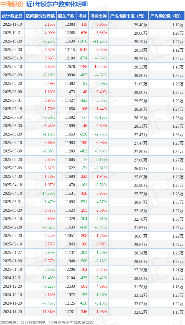 从股价来看,2025年10月31日至2025年11月10日,中瑞股份区间涨幅为2.15%,在此期间股东户数增加118.0户,增幅为0.96%。