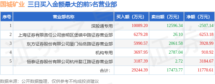 证券之星消息,沪深交易所2025年11月11日公布的交易公开信息显示,国城矿业(000688)因连续三个交易日内,涨幅偏离值累计达到20%的证券登上龙虎榜。此次是近5个交易日内第1次上榜。