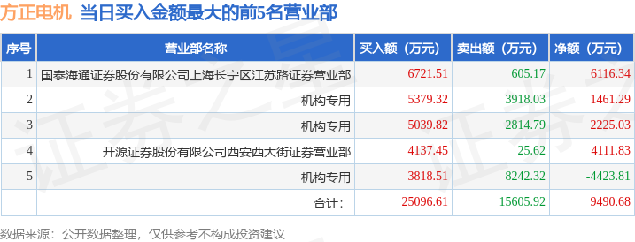 证券之星消息,沪深交易所2025年11月11日公布的交易公开信息显示,方正电机(002196)因日涨幅偏离值达到7%的前5只证券登上龙虎榜。此次是近5个交易日内第3次上榜。