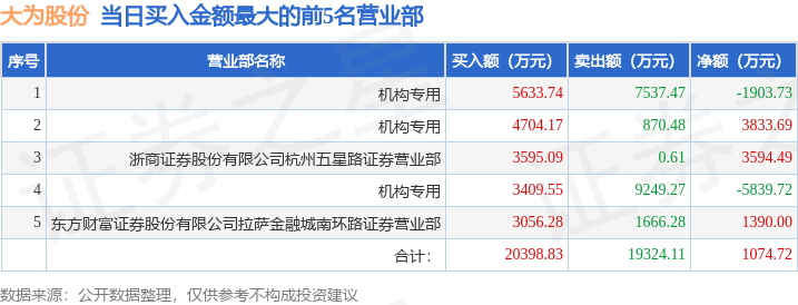 证券之星消息,沪深交易所2025年11月11日公布的交易公开信息显示,大为股份(002213)因日换手率达到20%的前5只证券登上龙虎榜。此次是近5个交易日内第3次上榜。