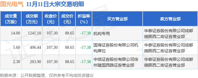 证券之星消息,11月11日国光电气发生大宗交易,交易数据如下:
