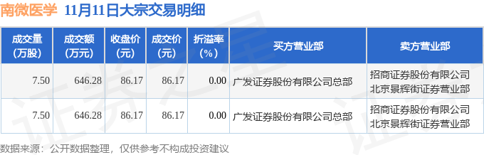 证券之星消息,11月11日南微医学发生大宗交易,交易数据如下: