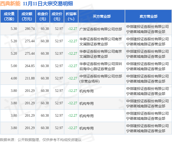 证券之星消息,11月11日西典新能发生大宗交易,交易数据如下:
