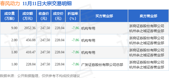 证券之星消息,11月11日春风动力发生大宗交易,交易数据如下: