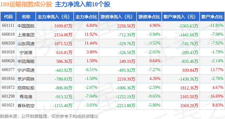 资金流向方面,180运输(000027)指数成份股当日主力资金净流出合计1.43亿元,游资资金净流入合计2473.77万元,散户资金净流入合计1.18亿元。成份股资金流向详情见下表: