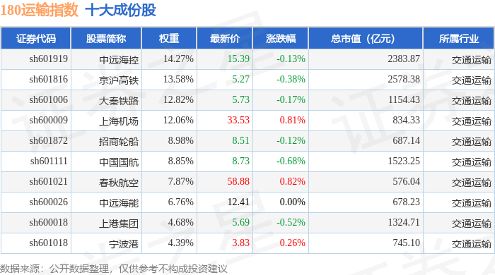 证券之星消息,11月11日,180运输(000027)指数报收于789.9点,跌0.01%,成交53.29亿元,换手率0.33%。当日该指数成份股中,上涨的有5家,春秋航空以0.82%的涨幅领涨,下跌的有7家,中国国航以0.68%的跌幅领跌。