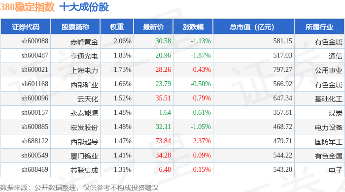 证券之星消息,11月11日,380稳定(000142)指数报收于10056.71点,跌0.12%,成交736.77亿元,换手率1.38%。当日该指数成份股中,上涨的有96家,三星医疗以10.02%的涨幅领涨,下跌的有90家,景旺电子以4.31%的跌幅领跌。