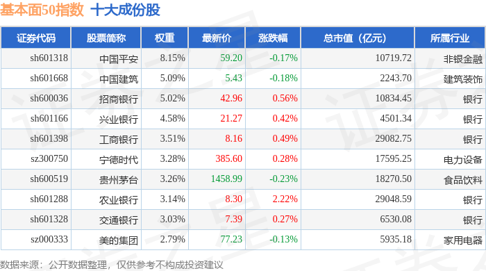 证券之星消息,11月11日,基本面50(000925)指数报收于4726.46点,跌0.11%,成交722.61亿元,换手率0.25%。当日该指数成份股中,上涨的有19家,农业银行以2.22%的涨幅领涨,下跌的有28家,工业富联以4.85%的跌幅领跌。