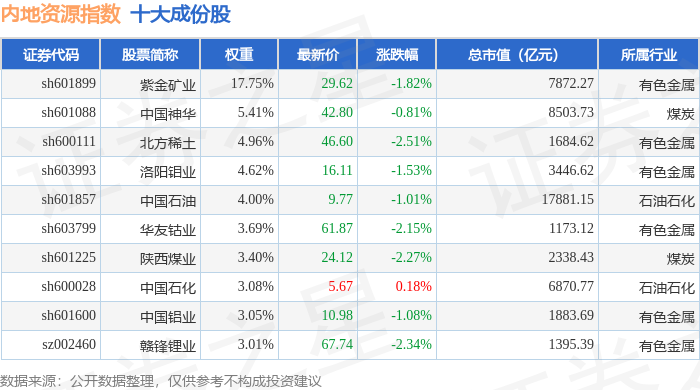 资金流向方面,内地资源(000944)指数成份股当日主力资金净流出合计36.34亿元,游资资金净流入合计10.55亿元,散户资金净流入合计25.8亿元。成份股资金流向详情见下表: