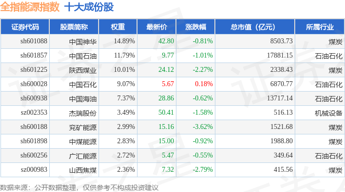 证券之星消息,11月11日,全指能源(000986)指数报收于2412.14点,跌1.0%,成交202.99亿元,换手率0.69%。当日该指数成份股中,上涨的有17家,宝泰隆以7.19%的涨幅领涨,下跌的有33家,兖矿能源以3.62%的跌幅领跌。