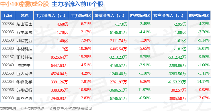 资金流向方面,中小100(399005)指数成份股当日主力资金净流出合计93.08亿元,游资资金净流入合计19.04亿元,散户资金净流入合计74.05亿元。成份股资金流向详情见下表:
