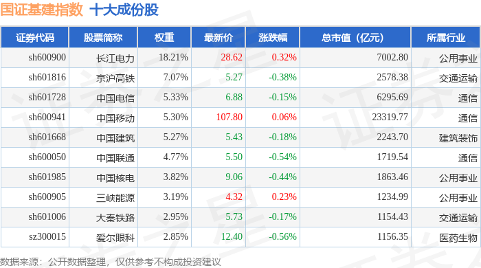 证券之星消息,11月11日,国证基建(399359)指数报收于2771.32点,跌0.12%,成交241.8亿元,换手率0.48%。当日该指数成份股中,上涨的有19家,中国核建以6.98%的涨幅领涨,下跌的有29家,电投能源以3.66%的跌幅领跌。