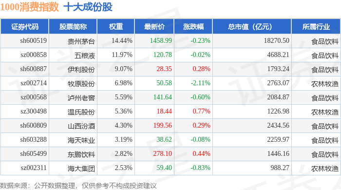 1000消费(399385)指数十大成份股详情如下: