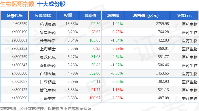 证券之星消息,11月11日,生物医药(399441)指数报收于2324.61点,跌0.44%,成交130.27亿元,换手率1.34%。当日该指数成份股中,上涨的有12家,爱美客以2.86%的涨幅领涨,下跌的有18家,华兰疫苗以3.07%的跌幅领跌。