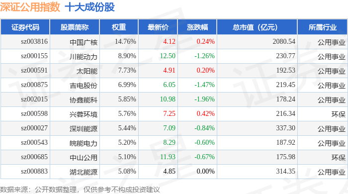 证券之星消息,11月11日,深证公用(399622)指数报收于1824.27点,跌0.3%,成交51.93亿元,换手率0.76%。当日该指数成份股中,上涨的有8家,云南能投以9.99%的涨幅领涨,下跌的有11家,协鑫能科以1.96%的跌幅领跌。
