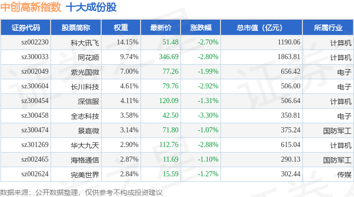 中创高新(399652)指数十大成份股详情如下: