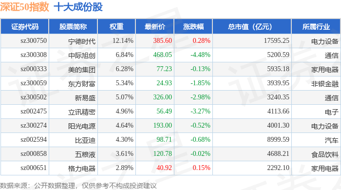 证券之星消息,11月11日,深证50(399850)指数报收于9063.64点,跌1.22%,成交1228.12亿元,换手率1.14%。当日该指数成份股中,上涨的有10家,爱美客以2.86%的涨幅领涨,下跌的有40家,中际旭创以4.48%的跌幅领跌。
