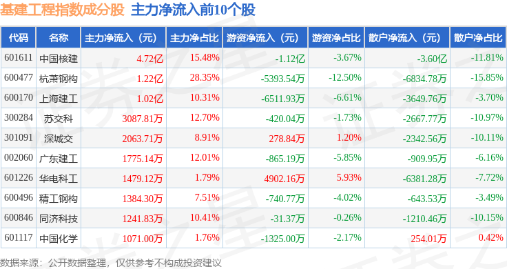 资金流向方面,基建工程(399995)指数成份股当日主力资金净流出合计2696.69万元,游资资金净流出合计5255.16万元,散户资金净流入合计7951.85万元。成份股资金流向详情见下表: