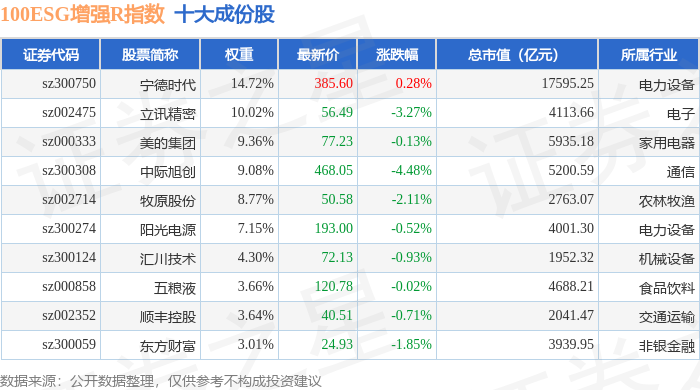 资金流向方面,100ESG增强R(470033)指数成份股当日主力资金净流出合计69.74亿元,游资资金净流入合计16.92亿元,散户资金净流入合计52.82亿元。成份股资金流向详情见下表: