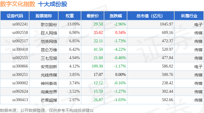 资金流向方面,数字文化(970047)指数成份股当日主力资金净流出合计17.32亿元,游资资金净流入合计2.75亿元,散户资金净流入合计14.58亿元。成份股资金流向详情见下表:
