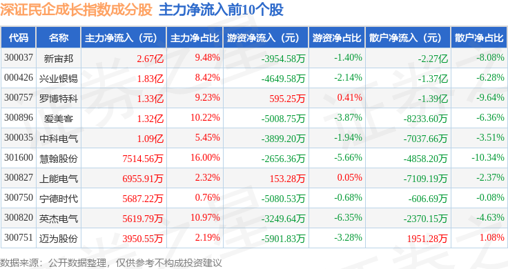资金流向方面,深证民企成长(970071)指数成份股当日主力资金净流出合计41.58亿元,游资资金净流入合计10.37亿元,散户资金净流入合计31.22亿元。成份股资金流向详情见下表: