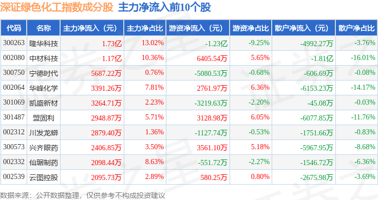 资金流向方面,深证绿色化工(970076)指数成份股当日主力资金净流出合计16.32亿元,游资资金净流出合计1.4亿元,散户资金净流入合计17.72亿元。成份股资金流向详情见下表: