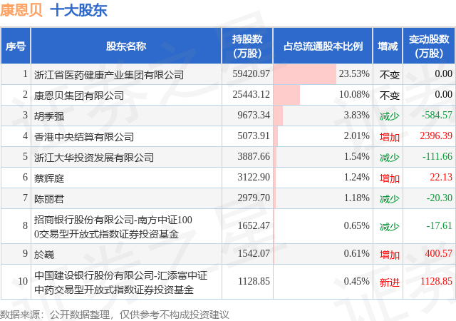 根据康恩贝2025年三季报公布的十大股东详情如下: