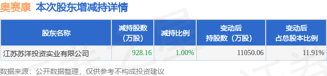 证券之星消息,11月11日奥赛康发布公告《奥赛康:持股5%以上股东股份变动触及1%的公告》,其股东江苏苏洋投资实业有限公司于2025年9月15日至2025年11月10日间合计减持928.16万股,占公司目前总股本的1.0%,变动期间该股股价下跌17.18%,截止11月10日收盘报18.8元。