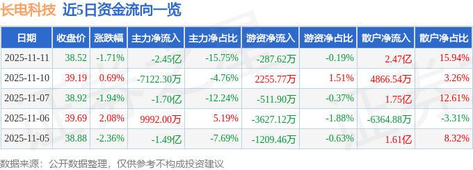 11月11日的资金流向数据方面,主力资金净流出2.45亿元,占总成交额15.75%,游资资金净流出287.62万元,占总成交额0.19%,散户资金净流入2.47亿元,占总成交额15.94%。